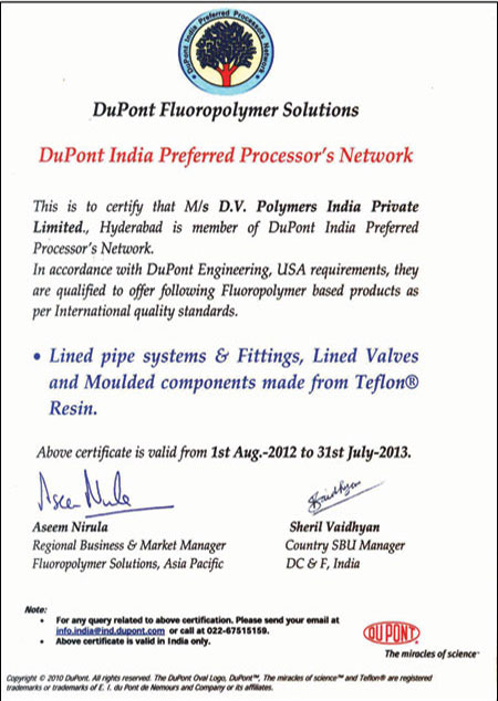 DuPont FluoroPolymer Solutions: One of the largest chemical companies in the world. DuPont India certified DV Polymers as a preferred processor network member for maintaining the quality in building and producing lined piped systems (LPS) and fittings from Teflon.