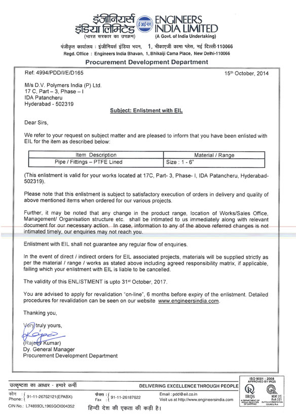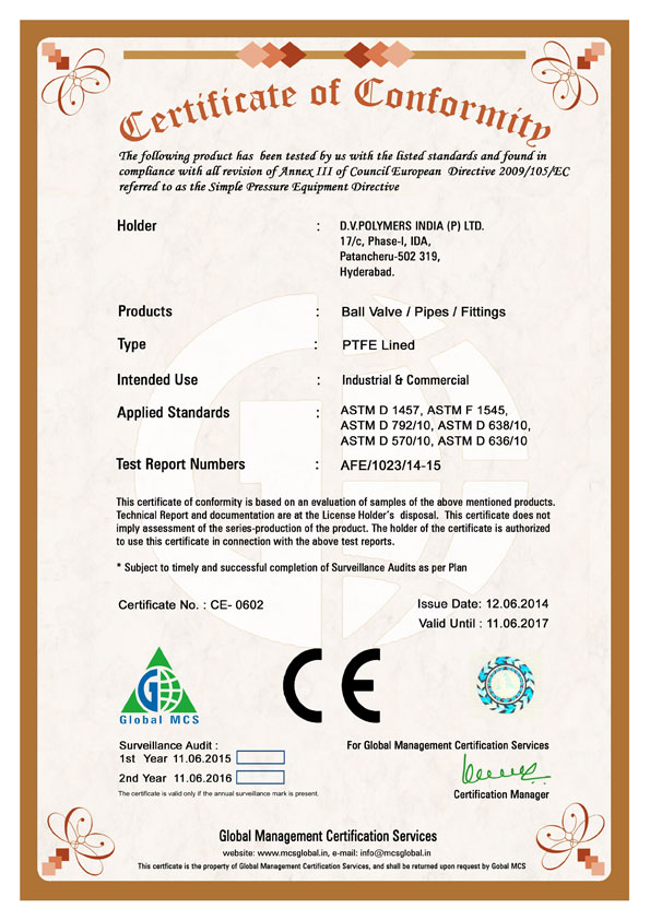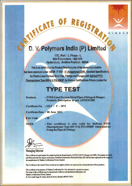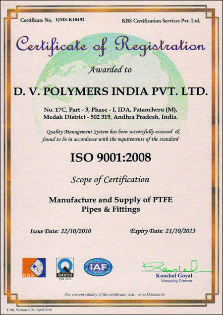 ISO 9001-2008: The most premium certification for maintaining quality, which is awarded by the International Standard Organization through its National Chapter. International Standard Organization certified DV Polymers for maintaining the respective documentation while manufacturing and supplying quality PTFE-lined pipes, fittings, and valves, etc.